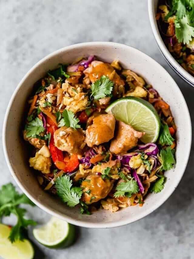 Heat a large skillet coated with avocado oil spray over medium heat Once hot, add the whisked eggs and scramble. Remove from the skillet and set aside. Spray the skillet to be coated,and add the shrimp. Cook 1-2 minutes per side until the shrimp are no long pink and cooked through. Once cooked, remove from the skillet and set aside. Next add the remaining skillet ingredients, except for the dark green parts of green onion. The skillet will be very full until it cooks down. Continue to cook for 8-12 minutes carefully stirring occasionally. Meanwhile, combine the sauce ingredients and whisk until well combined and smooth. Once the veggies are tender and cooked down, add the eggs and shrimp back to the skillet, the dark green parts of green onion, and the sauce. Stir to combine and allow to cook for another 1-2 minutes or until heated through. Serve hot with toppings.