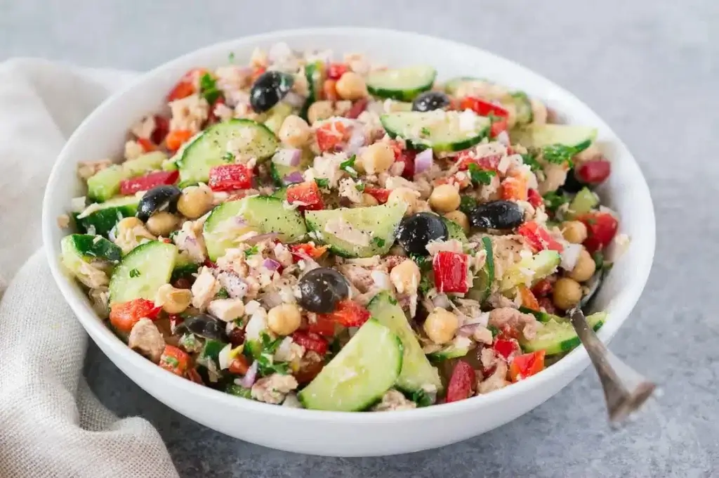 Combine all ingredients in a large bowl, and toss to combine. Serve over greens or with crackers of choice